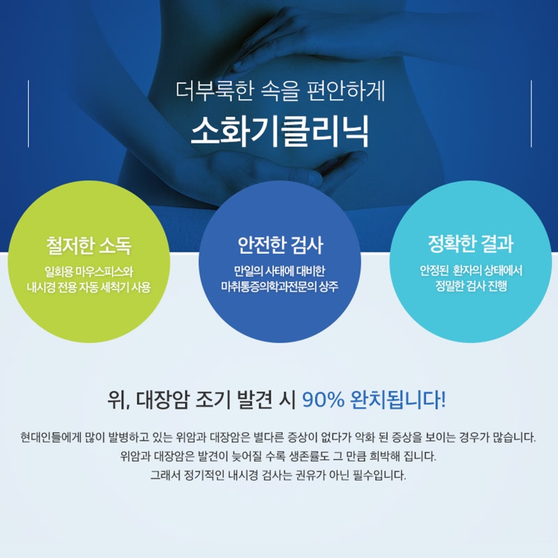 이러한 원인으로 국내에서는 위암 발생률이 높은 편인데, 이를 조기 발견하기 위해서는 정기적인 건강검진을 꼭 받으시는 것이 좋습니다.췌장암 환자의 5년 생존율이 10.8%인 반면 위암은 5년 생존율이 75.4%입니다. 즉 위암의 키워드는 ‘조기 진단’이라고 할 수 있습니다.